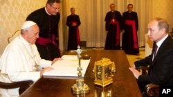 Папа Франциск и Путин также обменялись подарками. Путин передал личное приветствие патриарха Русской православной церкви, но не стал приглашать Франциска в Москву.