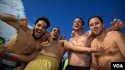 По-американски любая такая акция – это и веселый хепенинг, отсюда в толпе попадались персонажи в костюмах, с плакатами – куда же без пропаганды и агитации? А некоторые «медведи», а заодно с ними и «медведицы» весьма экстравагантными ужимками и прыжками удивляли друг друга и привлекали фотографов как до своего погружения, так и после оного.