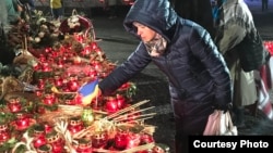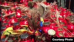 «Мы помним о Голодоморе, потому что он прошелся по моей семье, семье моих родственников», – говорит киевлянка Тамара Смеян. Она ставит лампадку со свечей и кладет у памятника несколько колосков пшеницы.