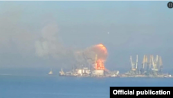 Запорожская областная администрация сообщила, что корабль был атакован в 7 утра. Утверждается, что повреждены ещё два российских корабля в порту, уничтожен резервуар на 3000 тонн топлива, а пожар перекинулся на склад боеприпасов.