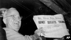 Демократ Гарри Трумэн, ставший президентом после смерти Франклина Рузвельта, ныне считается одним из величайших президентов США 20 века. В его активе – победа во Второй мировой войне, формирование многих современных международных институтов – от ООН до НАТО, реализация плана Маршалла, защита Южной Кореи от северокорейской агрессии, борьба с расовой дискриминацией и пр. Однако к моменту вступления во вторую избирательную кампанию (первую он выиграл чудом, опровергнув многие прогнозы) Трумэн был очень непопулярен среди избирателей. Президент понял это и решил сойти с дистанции. Выборы выиграл республиканец Дуайт Эйзенхауэр.