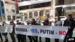 Всего в этот солнечный, но прохладный по меркам нынешней ранней весны день на Таймс-сквер, между 48-й и 49-й улицами собрались примерно 35-40 человек. Горожане и туристы с любопытством поглядывали на выстроившихся в цепочку вдоль тротуара демонстрантов с большим транспарантом «Россия – да! Путин – нет!»