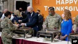 Президент Байден и его жена Джилл в понедельник помогали подавать обеды в честь Дня Благодарения военнослужащим в Форт-Брэгге, штат Северная Каролина, поблагодарив их таким образом за службу и преданность стране.