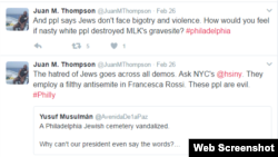 В дополнение к ложным сообщениям о заложенных взрывных устройствах, еврейские кладбища в двух штатах в течение прошедших недель подверглись актам вандализма. Одно из кладбищ находится в Сент-Луисе, неподалеку от места ареста Томпсона. Были повреждены сотни надгробий, установленных на кладбище, начиная с 1800-х годов.