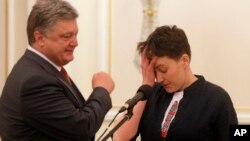 Как сообщает корреспондент Русской службы «Голоса Америки» из Киева, во время обращения президента Украины к прессе зачитан указ о присвоении Надежде Савченко звания Героя Украины с вручением высшей государственной награды – ордена Золотая звезда.