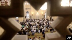 Плотный поток мальчиков и бородатых мужчин в традиционных мусульманских одеждах проходит мимо вооруженных охранников, патрулирующих оформленную в виде парка территорию, и заходит в мечеть через металлоискатели.