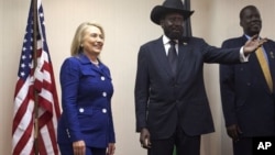 Клинтон выступила перед журналистами в ходе краткого визита в столицу Южного Судана, Джубу, где она встретилась с президентом Сальвой Киир.