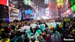 Сотни туристов собрались на площади Таймс-сквер в Нью-Йорке, чтобы увидеть падение хрустального шага, которое уже более ста лет возвещает о приходе Нового года.