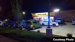Одетый в зеленую куртку на голое тело мужчина вышел из машины и застрелил двух человек на парковке кафе Waffle House, после чего открыл огонь внутри заведения.