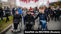 Более 200 людей с инвалидностью приняли участие в акции протеста в Минске, продолжив не затихающую уже почти три месяца волну протестов против переизбрания президента Александра Лукашенко.