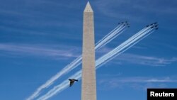 Пилотажные группы ВВС США «Буревестники» и ВМС США «Голубые ангелы» провели в субботу воздушный парад над Вашингтоном в честь людей, находящихся на передовых линиях борьбы со вспышкой коронавируса.