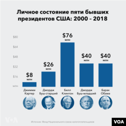 Дороже всех бюджету обошелся Билл Клинтон, который с 2000 года получил из казны 21 млн долларов. При этом личное состояние самого Клинтона оценивается в более чем 70 млн долларов. Барак Обама после ухода из Белого дома ежегодно получает в виде компенсаций 1,4 млн долларов, Джордж Буш-младший – 1,2 млн долларов в год. При этом оба экс-президента обладают многомиллионными состояниями.