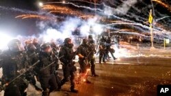В субботу полиция Портленда арестовала 59 человек и применила слезоточивый газ, когда протестующие начали бросать в офицеров камни и зажигательные бомбы.