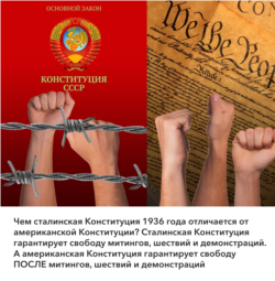 К сожалению, в отношении прав и свобод человека Россия и Америка — это полные антиподы. Концепции прав и свобод человека в Российской Империи просто не существовало. В 1917 году произошла революция, права получают угнетенные слои населения — и строится уже социалистическое общество. В Конституции 1936 года (сталинской) впервые был закреплен развернутый перечень прав и свобод. Но закреплен он был так, что непросвещенный читатель мог бы сказать: «Боже, какая прекрасная Конституция!» Но если почитать ее внимательно, можно увидеть, что реализация всех этих прав условна. Права на свободу митингов, шествий и собраний можно было реализовать только в тех пределах, в которых они не нарушали бы основ социалистической государственности.