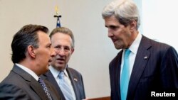 Находящийся с визитом в Мексике госсекретарь Джон Керри выступил на совместной пресс-конференции с главой внешнеполитического ведомства этой страны Хосе Антонио Меаде.