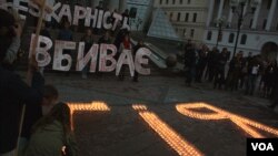 В память о них на мраморных плитах из свечей они выложили имя исчезнувшего тринадцать лет назад журналиста Гонгадзе – «Гия» и сложили из букв слоган «Безнаказанность – убивает».