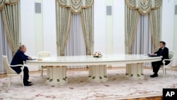 Наблюдателей поразила картина, когда Макрон и Путин сидели на противоположных концах четырехметрового стола, когда обсуждали кризис вокруг Украины.