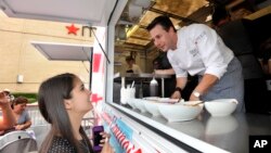 Каждое утро на улицы американской столицы выезжают более двухсот мобильных кафе. Мобильные кафе предлагают блюда на любой вкус – это и французские блины, и настоящие американские стейки, и итальянская лазанья. И в лучшие кафе выстраивается самая настоящая очередь. Подробности – в видеосюжете.