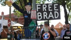 Хайка, преподаватель политологии из Бостона, штат Массачусетс, держит плакат, «Брэд — мой герой». «Он мой герой, потому что он обнаружил свидетельство того, что США ответственны за военные преступления, и это неправильно, и мы должны это знать, — говорит она. — Я удивлена, что прокурор не попросил для него высшей меры наказания за "оказание помощи врагу". Может, то, что они не пытаются казнить его, наша маленькая победа — из-за протестов, убивать его стало политически невыгодным.