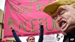 ВАШИНГТОН – Тысячи и тысячи протестующих, как женщины, так и мужчины, приняли участие в субботу в «Марше женщин на Вашингтон». В розовых шапках и с плакатами в руках они собрались перед сценой на Индепенденс авеню.