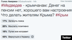 Тем временем подписчики «Голоса Америки» в Twitter ответили на вопрос, что делать жителям Крыма после таких слова Медведева. В сумме 57 процентов принявших участие в опросе готовы терпеть и верят в способность российской власти все исправить. В то же время 43 процента считают, что жителям Крыма стоит вернуться в Украину.