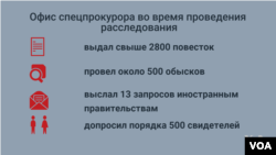 Офис спецпрокурора во время проведения расследования выдал свыше 2800 повесток, провел около 500 обысков, выслал 13 запросов иностранным правительствам, опросил порядка 500 свидетелей.