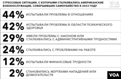 Специалисты Пентагона отметили, что многие из совершивших самоубийство сталкивались с серьезными стрессовыми факторами. Например, 44% из них испытывали проблемы в отношениях, а у 42% были диагностированы проблемы в области психического здоровья.