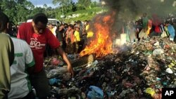 Местные СМИ сообщили, что сотни жителей города Маунт-Хаген, среди которых были дети, наблюдали, как подозреваемую связали, облили бензином и бросили в кучу горящего мусора и покрышек.