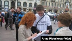 Корреспондент «Голоса Америки» отправилась к Гостиному двору, где проходит сбор подписей под письмом к Юрию Чайке. Одна из пикетчиц – член петербургского отделения «Парнаса» Ольга Борисова, державшая в руках плакат «Свободу Андрею Пивоварову!», сообщила: «У меня здесь на днях произошел любопытный случай. Я раньше работала в органах внутренних дел, была младшим сержантом. И вот, подходят к нам полицейские, и среди них был один мой знакомый, с которым мы вместе учились. Он удивился, увидев меня здесь, начал расспрашивать, кто такой Пивоваров, а под конец разговора дал свой телефон и сказал, чтобы я ему сразу же позвонила, если меня здесь кто-нибудь будет обижать», – смеясь, рассказала Ольга Борисова.