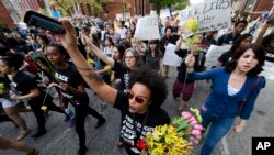 В Балтиморе проходит новая крупномасштабная акция протеста. Полиция предполагает, что она сохранит мирный характер. Демонстранты идут от главной станции метро к зданию городской администрации, протестуя против обращения полицейских с афроамериканцами.