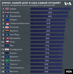 Больше всего голосов было отдано за Гавайи – островной штат победил в 69% случаев. На втором месте – Колорадо (65%), известный своими горными пейзажами, национальными парками, а также растущей индустрией производства каннабиса, которая продолжает привлекать в Колорадо жителей других регионов. На третьем месте – Вирджиния (64%), которая привлекает туристов историческими достопримечательностями и океаническим побережьем.