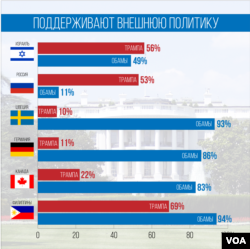 С наименьшим доверием к Трампу относятся к Мексике (5 процентов) и Испании (7 процентов). По сравнению с Обамой рейтинг улучшился в двух странах: России, где уровень доверия к американскому президенту вырос с 11 до 53 процентов, и Израиле (с 7 до 56 процентов).