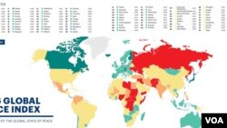 МОСКВА – Россия по традиции последних лет оказалась в последней десятке «списка миролюбия», опустившись за год еще на одну позицию ниже. Об этом свидетельствует обнародованный в среду международным Институтом экономики и мира (The Institute for Economics and Peace) «Глобальный индекс миролюбия» (Global Peace Index).