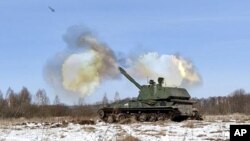 Министерство распространило видео, на котором российские солдаты в зимнем камуфляже тренируются рядом с танками на фоне зимнего пейзажа, стреляя из оружия, в том числе из артиллерии.