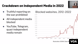 Государство заблокировало или закрыло большинство оставшихся независимыми СМИ. Хотя многие из них переехали за границу и продолжили освещать события, для большинства россиян они оказались недоступны, из-за отсутствия VPN.