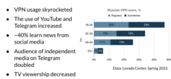 До широкомасштабного вторжения в Украину, в РФ мало кто пользовался VPN, однако сейчас таких - около четверти населения России. Это в основном молодые люди, которые предпочитают YouTube и Telegram именно потому, что там у них есть доступ к «независимым голосам».