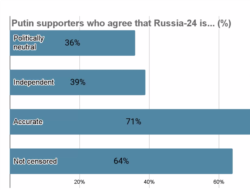 В результате восприятие государственных и независимых СМИ оказалась поляризованным. Среди поддерживающих Путина более двух третей говорят, что доверяют государственным СМИ, и почти никто не говорит, что доверяет независимым. И наоборот, меньшинство, предпочитающее независимые источники, не доверяет госСМИ.