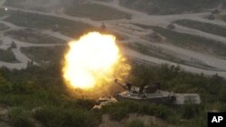 Американские танки и вертолеты поразили цели в Пхочхоне, в то время как около 2 тыс американских десантников и южнокорейских солдат провели маневры по соседству.