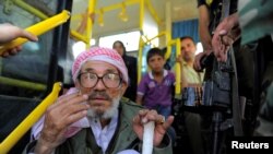 Государственное телевидение Сирии показало кадры отправки первых зеленых автобусов – на кадрах видны несколько повстанцев с длинными бородами – в салоне автобуса вместе с их семьями.