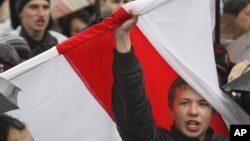 Как сообщает корреспондент Русской службы «Голоса Америки» из Киева, участники митинга держали национальные флаги двух стран, символику украинских националистов, плакаты политических заключенных.