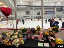 На этом снимке, снятом корреспондентом «Голоса Америки», — стихийный мемориал на ледовой арене в Болстоне, штат Вирджиния.