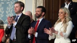 Трое из пяти детей президента Трампа: Эрик, Дональд-младший и Тиффани Трамп, хлопают отцу