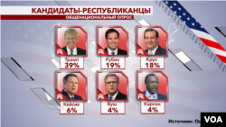 Согласно опубликованному в среду опросу Университета Куиннипиак, Трамп лидирует с 39 процентами голосов, а следом за ним идут сенатор от штата Флорида Марко Рубио с 19 процентами и сенатор от штата Техас Тед Круз с 18 процентами.