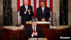 Президент Украины Петр Порошенко в четверг был встречен бурными и продолжительными овациями на Капитолийском холме, где он выступил с эмоциональной речью на совместном заседании Сената и Палаты представителей. Порошенко обратился к Конгрессу с просьбой предоставить военную, политическую и экономическую поддержку его стране, чтобы она могла и дальше противостоять «варварству» России.