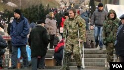 На площади Независимости, где ровно год назад находился лагерь сторонников евроинтеграции, сегодня много людей в камуфляжной и военной форме. У некоторых из них на рукавах нашиты знаки отличия добровольческих батальонов, принимающих участие в борьбе с пророссийскими сепаратистами на востоке Украины.