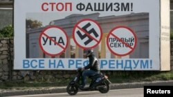 Повсюду развешаны пророссийские биллборды, некоторые из которых представляют референдум как выбор между Россией и «фашизмом», то есть властью нового прозападного руководства в Киеве.