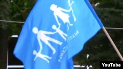 На флаге на однотонном голубом фоне изображены мать, отец и трое детей. К изображению добавлен хэштег #НастоящаяСемья.