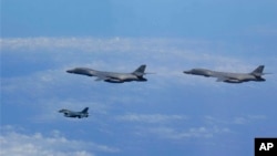 Два бомбардировщика ВВС США B-1B Lancers при поддержке южнокорейских истребителей провели учения с боевой стрельбой в небе над Южной Кореей, вблизи границы с КНДР. Эта военная демонстрация стала ответом на агрессивные действия Пхеньяна, который на этой неделе провел испытания МБР (межконтинентальной баллистической ракеты). Об этом официально заявили военные власти в Сеуле.