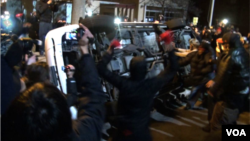 Поздно вечером во вторник группа протестующих разбила окна и подожгла полицейскую машину напротив здания городской мэрии. Как передает корреспондент «Голоса Америки», большое число специально вооруженных полицейских и служащих Национальной гвардии прибыли в этот район на бронетехнике и потребовали от протестующих разойтись.
