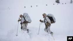 На высоте почти 2 500 метров, где расположен тренировочный лагерь, воздух разрежен, лежат глубокие сугробы и стоят сильные морозы. Однако всего в нескольких километрах другая группа морпехов готовится к атаке, поскольку им необходимо уметь сражаться в суровых погодных условиях.